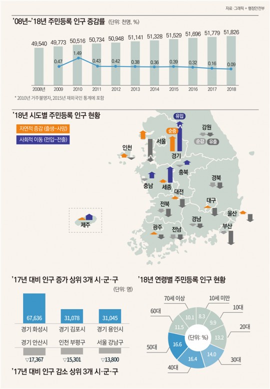 ÇàÁ¤¾ÈÀüºÎ(Àå°ü ±èºÎ°â)¿¡ µû¸£¸é 2018³â ¸» ¿ì¸®³ª¶ó Áֹεî·Ï Àα¸´Â 51,826,059¸íÀ¸·Î, Áö³ 2017³â ¸»(51,778,544¸í)¿¡ ºñÇØ 47,515¸í(0.1%) ´Ã¾ú´Ù. ¿¬·Éº° ºÐÆ÷´Â 50´ë°¡ 8,615,884¸í(16.6%)À¸·Î Àü³â´ëºñ 125,680¸í ´Ã¾î °¡Àå ¸¹¾Ò´Ù.