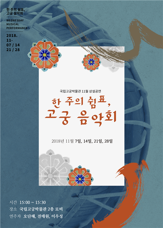 ¹®ÈÀçû ±¹¸³°í±Ã¹Ú¹°°ü(°üÀå Áöº´¸ñ)Àº 11¿ù ¸ÅÁÖ ¼ö¿äÀÏ(7ÀÏ, 14ÀÏ, 21ÀÏ, 28ÀÏ) ¿ÀÈÄ 3½Ã, »ó¼³°ø¿¬ ‘ÇÑ ÁÖÀÇ ½°Ç¥, °í±Ã À½¾Çȸ’¸¦ ¹Ú¹°°ü 2Ãþ ·Îºñ¿¡¼ °³ÃÖÇÑ´Ù.
