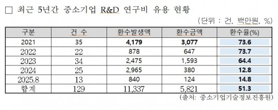 ±¹È¸ »ê¾÷Åë»óÀÚ¿øÁß¼Òº¥Ã³±â¾÷À§¿øÈ¸ ¼Ò¼Ó ±èµ¿¾Æ ÀÇ¿ø(´õºÒ¾î¹ÎÁÖ´ç, ¼¿ï ¼´ë¹®°©)ÀÌ Áß¼Ò±â¾÷±â¼úÁ¤º¸ÁøÈï¿ø(ÀÌÇÏ ±âÁ¤¿ø)À¸·ÎºÎÅÍ Á¦Ãâ¹ÞÀº ‘ÃÖ±Ù 5³â°£ Áß¼Ò±â¾÷ R&D ¿¬±¸ºñ À¯¿ë ÇöȲ’ÀÚ·á¿¡ µû¸£¸é R&D ¿¬±¸ºñ À¯¿ëÀº 129°ÇÀ¸·Î 110¾ï ¿øÀ» ȯ¼öÇØ¾ß ÇÏ´Â °ÍÀ¸·Î ³ªÅ¸³µ´Ù.