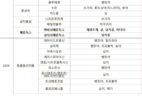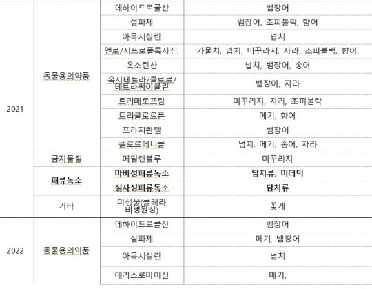 2020³âºÎÅÍ ¿Ã 6¿ù ¸»±îÁö ÁøÇàµÈ ¼ö»ê¹° ¾ÈÀü¼º Á¶»ç¿¡¼ ÆÐ·ùµ¶¼Ò 1,126°Ç, µ¿¹°¿ë ÀǾàǰ 240°Ç, Áß±Ý¼Ó 32°Ç, ±ÝÁö¹°Áú 12°Ç, ±âŸ 22°Ç µî ÃÑ 1,432°ÇÀÇ ºÎÀûÇÕ »ç·Ê°¡ ³ªÅ¸³µ´Ù. ÀÌÁß ÆÐ·ùµ¶¼Ò´Â 78.6%¸¦ Â÷ÁöÇØ ¼ö»ê¹° ¾ÈÀü¼ºÀ» °¡Àå Å©°Ô À§ÇùÇÏ´Â ¿äÀÎÀ¸·Î µîÀåÇß´Ù.