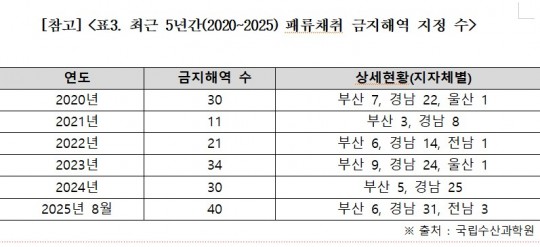 ÆÐ·ùµ¶¼Ò Çã¿ëÄ¡¸¦ ÃʰúÇØ ÇØ¾ç¼ö»êºÎ°¡‘ÆÐ·ù äÃë ±ÝÁöÇØ¿ª’À¸·Î ÁöÁ¤ÇÏ¿© °ü¸®ÇÏ´Â ±ÝÁöÇØ¿ª ¿ª½Ã ¿Ã 8¿ù ¸» ±âÁØ 40°÷À¸·Î 2020³â 30°÷, 2021³â 11°÷, 2022³â 21°÷, 2023³â 34°÷, 2024³â 30°÷º¸´Ù ÈξÀ Áõ°¡Çß´Ù.