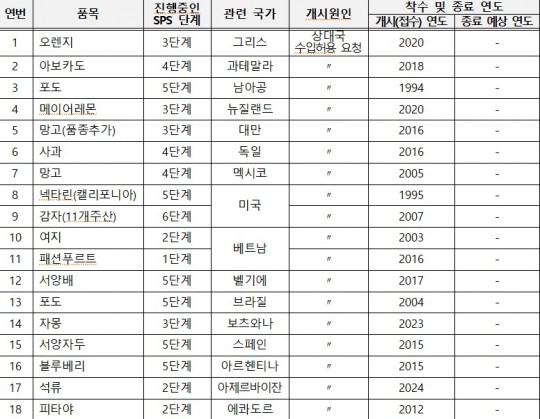 ÇöÀç ´Ü°èÀûÀ¸·Î º¼ ¶§ °¡Àå »óÀ§ ´Ü°è¿¡¼ ÁøÇà ÁßÀΠǰ¸ñÀº ¹Ì±¹»ê °¨ÀÚ¿Í ¿ìÁŰ½ºÅº Æ÷µµ·Î ¼öÀÔ¿ä°Ç ÃʾÈÀ» ÀÛ¼ºÇÏ´Â 6´Ü°è¸¦ ¹â°í ÀÖ´Ù. ¹Ì±¹»ê °¨ÀÚ´Â 2007³â ¹Ì±¹ ÃøÀÇ ¼öÀÔÇã¿ë¿äûÀÌ µé¾î¿Â ÀÌÈÄ 18³â, ¿ìÁŰ½ºÅº Æ÷µµ´Â 2018³â ÀÌÈÄ 7³â µ¿¾È ÀýÂ÷°¡ ÁøÇà ÁßÀÌ´Ù.