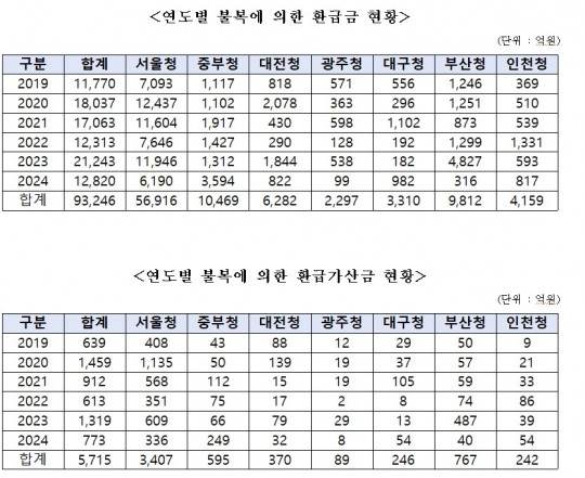 °°Àº ±â°£ Á¶¼¼ ºÒº¹ ȯ±Þ°¡»ê±Ýµµ ÃÑ 5,715¾ï ¿øÀÌ Áö±ÞµÆ´Ù. 2019³â 639¾ï ¿ø¿¡¼ 2020³â 1,459¾ï ¿øÀ¸·Î ´Ã¾ú°í, 2023³â¿¡´Â 1,319¾ï ¿ø, 2024³â¿¡µµ 773¾ï ¿øÀÌ Áö±ÞµÆ´Ù