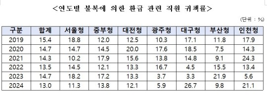 ƯÈ÷ ºÒº¹ »ç°Ç Áß Á÷¿ø ±ÍÃ¥·üÀÌ ¹®Á¦·Î ÁöÀûµÈ´Ù. ÃÖ±Ù 6³â°£ ±¹¼¼Ã» Àüü ±ÍÃ¥·üÀº 13~15% ¾ÈÆÆ¿¡ ¸Ó¹°·¯, Á¶¼¼ ºÒº¹ 10°Ç °¡¿îµ¥ 1°Ç ÀÌ»óÀº Á÷¿ø À߸øÀ¸·Î ȯ±ÞÀÌ ¹ß»ýÇÑ ¼ÀÀÌ´Ù.