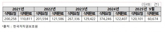 ´õ¿í Å« ¹®Á¦´Â ÇØ¿Ü ºÒ¹ýÀúÀÛ¹° À¯Åë »çÀÌÆ®¿¡¼ Àû¹ßµÈ, ÀúÀÛ±ÇÄ§ÇØ ÀúÀÛ¹°¿¡ ´ëÇÑ »èÁ¦¿äû °ÇÀº ÇØ¸¶´Ù ´Ã°í ÀÖÁö¸¸, 24³â¿¡ »èÁ¦µÈ ÀúÀÛ¹°Àº 33%µµ µÇÁö ¾Ê¾Ò´Ù.