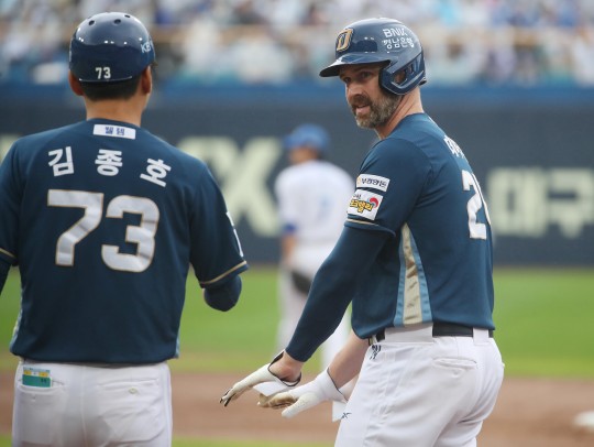 NC ´ÙÀ̳뽺ÀÇ °æ±â. 5ȸÃÊ 1»ç »óȲ¿¡¼ Ÿ¼®¿¡ µé¾î¼± NC ±èÇüÁØÀÌ ¼Ö·ÎȨ·±À» Ä£ ÈÄ µ¿·áµéÀÇ