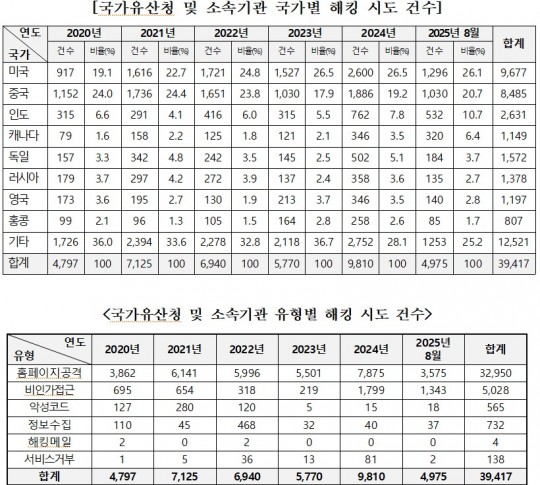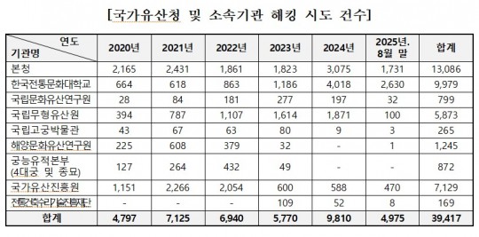 (ºÒž´º½º=¼ÛÇàÀÓ±âÀÚ) ±¹°¡À¯»êû ¹× ¼Ò¼Ó±â°üÀ» ³ë¸° ÇØÅ· ½Ãµµ°¡ ¿ÃÇØ¿¡¸¸ 5õ °Ç¿¡ ´ÞÇÑ °ÍÀ¸·Î ³ªÅ¸³µ´Ù.
