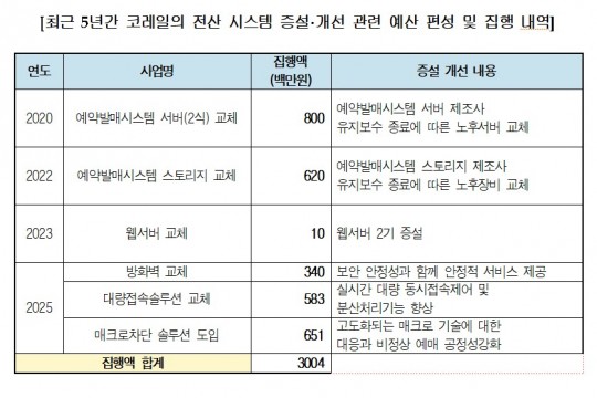 ±¹È¸ ±¹Åä±³ÅëÀ§¿øÈ¸ Á¤Á¡½Ä ÀÇ¿ø(±¹¹ÎÀÇÈû, °æ³² Å뿵½Ã·°í¼º±º)ÀÌ Çѱ¹Ã¶µµ°ø»ç(ÀÌÇÏ ‘ÄÚ·¹ÀÏ’)·ÎºÎÅÍ Á¦Ãâ¹ÞÀº <Àü»ê ½Ã½ºÅÛ Áõ¼³·°³¼± °ü·Ã ¿¹»ê Æí¼º ¹× ÁýÇà ³»¿ª> ÀÚ·á¿¡ µû¸£¸é, ÄÚ·¹ÀÏÀº 2020³â 8¾ï ¿ø, 2022³â 6¾ï 2õ¸¸ ¿ø, 2023³â 1õ¸¸ ¿ø, 2025³â 15¾ï 7õ 4¹é¸¸ ¿ø µî ÃÑ 30¾ï ¿øÀÇ ¿¹»êÀ» Àü»ê ½Ã½ºÅÛ Áõ¼³ ¹× °³¼±¿¡ ÁýÇàÇß´Ù.