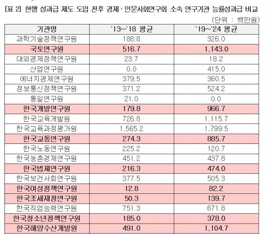 2019³â ÇöÇà Á¦µµ¸¦ µµÀÔÇÑ ÀÌÈÄ, ±¹Å俬·KDI·±³Å뿬·¹ýÁ¦¿¬ µî ¿©·¯ ±â°ü¿¡¼ ¼º°ú±Þ Áö±Þ¾×Àº ÀÌÀüº¸´Ù 2¹è ÀÌ»ó ºÒ¾î³µ´Ù.:[Ç¥ 2] ÂüÁ¶