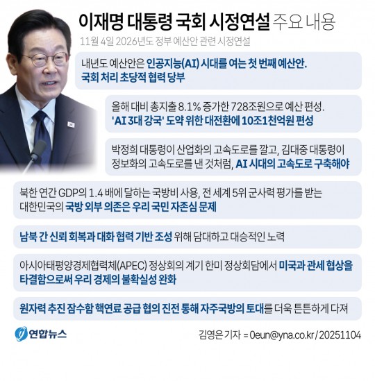 ±¸Ã¼ÀûÀÎ ¿¹»ê Æí¼º ¿øÄ¢À¸·Î´Â "ÃÑÁöÃâÀ» ¿ÃÇØ ´ëºñ 8.1% Áõ°¡ÇÑ 728Á¶¿øÀ¸·Î Æí¼ºÇÑ °¡¿îµ¥, 'AI 3´ë °±¹' µµ¾àÀ» À§ÇÑ ´ëÀüȯ¿¡ 10Á¶1õ¾ï¿øÀ» Æí¼ºÇß´Ù"¸ç "'ÇÇÁöÄà AI' ¼±µµ ±¹°¡ ´Þ¼ºÀ» À§ÇØ ÁýÁß ÅõÀÚÇϰڴÙ"°í ¼Ò°³Çß´Ù.