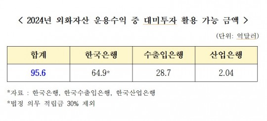 - Áö³ÇØ Çѱ¹ÀºÇà · ¼öÃâÀÔÀºÇà · »ê¾÷ÀºÇà ¿ÜÈÀÚ»ê¿î¿ë¼öÀÍ±Ý Áß ´ë¹ÌÅõÀÚ °¡´É ÀÚ»ê 95 ¾ï 6,000 ¸¸´Þ·¯¿¡ ºÒ°ú