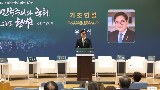 ¡ã¿ì¿ø½Ä ±¹È¸ÀÇÀåÀÌ 3ÀÏ(¼ö) ¿ÀÀü ±¹È¸ÀÇ¿øÈ¸°ü Á¦1¼ÒȸÀǽǿ¡¼ ¿¸° '12·3 ºñ»ó°è¾ö ÇØÁ¦ 1Áֳ⠰øµ¿Çмú´ëȸ'¿¡ Âü¼®ÇØ ±âÁ¶¿¬¼³À» Çϰí ÀÖ´Ù.(»çÁøÃâó=±¹È¸»ç¹«Ã³, »çÁøÁ¦°ø=´º½Ã½º)