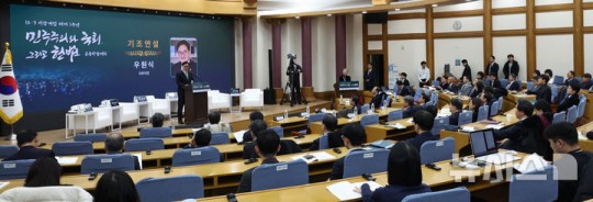 ¿ì ÀÇÀåÀº ±âÁ¶¿¬¼³¿¡¼ "ÆøÇ³ °°¾Ò´ø Áö³ 1³â, ¿ì¸® ±¹¹Îµé ´öºÐ¿¡, Àß ÇìÃĿ °Í °°´Ù"¸ç "12·3 ºñ»ó°è¾ö ÇØÁ¦ 1ÁÖ³âÀ» ¸Â¾Æ¼ ±¹³»·¿Ü À¯¼öÀÇ ÇÐÀÚµé°ú ¾ð·ÐÀεéÀ» ¸ð½Ã°í 12·3 »çÅÂÀÇ Àǹ̸¦ µÇ¤¾îº¸°í, ¿ì¸®ÀÇ ¹ÎÁÖÁÖÀǸ¦ ´õ¿í ±»°ÇÈ÷ ÇÒ ¹æ¾ÈÀ» ³íÀÇÇÏ´Â ¶æ±íÀº ÀÚ¸®¸¦ °®°Ô µÇ¾î ±â»Ú´Ù"°í ¼Òȸ¸¦ ¹àÇû´Ù.