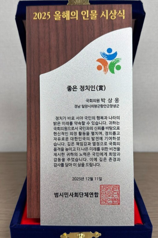 ¹Ú»ó¿õ ÀÇ¿ø, ½Ã¹Î´Üü ¼±Á¤ ‘2025 ¿ÃÇØÀÇ ÁÁÀº Á¤Ä¡ÀÎ»ó’ ¼ö»ó ¿µ¿¹