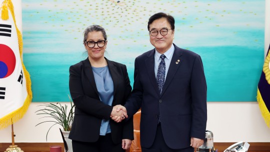 ¡ã¿ì¿ø½Ä ±¹È¸ÀÇÀåÀÌ 26ÀÏ(¿ù) ÀÇÀåÁý¹«½Ç¿¡¼ À×°Å ¾Ö½Ì ¼¼À̺ê´õÄ¥µå·± ÀÎÅͳ»¼Å³Î ÃÖ°í°æ¿µÀÚ(CEO)¿Í ¹Ý°©°Ô ¾Ç¼öÇϰí ÀÖ´Ù.(»çÁø=±¹È¸»ç¹«Ã³ »çÁøÆÀ)
