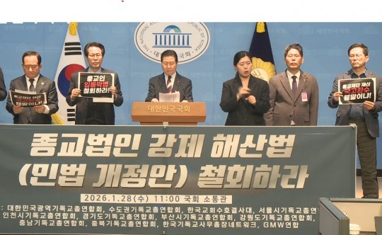 2026³â 1¿ù 28ÀÏ, ±¹¹ÎÀÇÈû Á¶¹è¼÷ ÀÇ¿ø ÁÖÃÖ·Î ±¹È¸ ¼ÒÅë°ü¿¡¼ ¿¸° ±âÀÚȸ°ß¿¡¼ ±³°è ´ÜüµéÀº ÃÖÇõÁø ÀÇ¿øÀÌ ´ëÇ¥ ¹ßÀÇÇÑ ¹Î¹ý °³Á¤¾ÈÀÌ Çå¹ý»ó Á¾±³ÀÇ ÀÚÀ¯¿Í Á¤±³ºÐ¸® ¿øÄ¢À» Á¤¸éÀ¸·Î À§¹èÇÑ´Ù°í ºñÆÇÇÏ¸ç ¼º¸í¼¸¦ ¹ßÇ¥Çß´Ù.