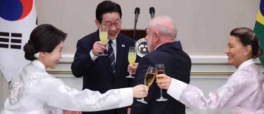 ÀÌÀç¸í ´ëÅë·É°ú ·çÀ̽º À̳ª½Ã¿ì ·ê¶ó ´Ù½Ã¿ì¹Ù ºê¶óÁú ´ëÅë·ÉÀÌ 23ÀÏ Ã»¿Í´ë¿¡¼ ¿¸° ±¹ºó ¹æÇÑ È¯¿µ ¸¸Âù¿¡¼ °Ç¹èÇϰí ÀÖ´Ù(»çÁøÃâó=¿¬ÇÕ´º½º)