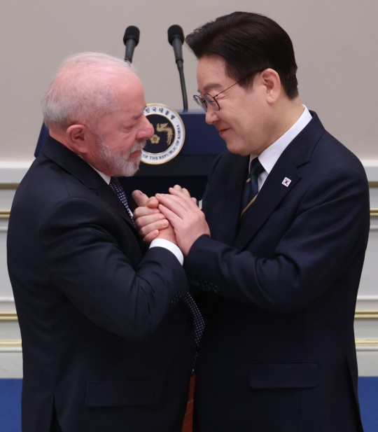 ÀÌÀç¸í ´ëÅë·ÉÀÌ 23ÀÏ Ã»¿Í´ë¿¡¼ ¿¸° ·çÀ̽º À̳ª½Ã¿ì ·ê¶ó ´Ù½Ã¿ì¹Ù ºê¶óÁú ´ëÅë·É ±¹ºó ¹æÇÑ È¯¿µ ¸¸Âù¿¡¼ ´ä»ç¸¦ À§ÇØ À̵¿ÇÏ´Â ·ê¶ó ´ëÅë·É°ú ¼ÕÀ» ¸ÂÀâ°í ÀÖ´Ù.(»çÁøÃâó=¿¬ÇÕ´º½º)