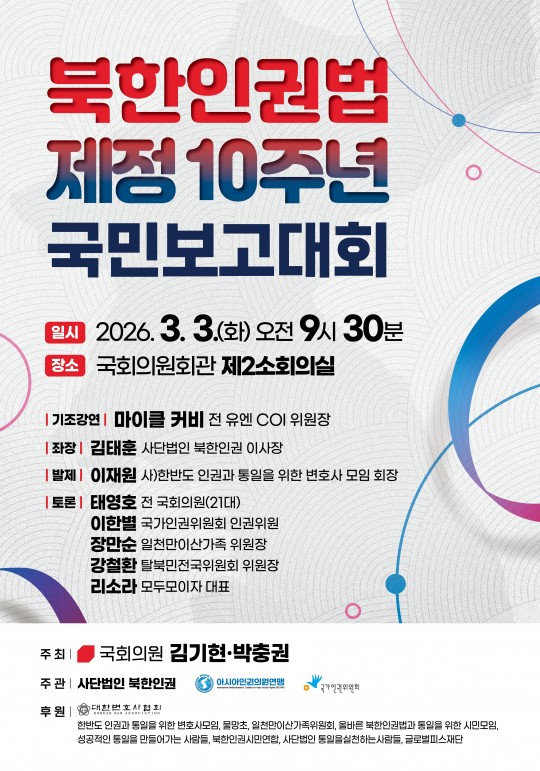 ( ºÒž´º½º=¼ÛÇàÀÓ±âÀÚ)¹ÚÃæ±Ç ÀÇ¿ø(±¹¹ÎÀÇÈû)°ú ±è±âÇö ÀÇ¿ø(±¹¹ÎÀÇÈû)ÀÌ °øµ¿ ÁÖÃÖÇÏ´Â ¡¸'ºÏÇÑÀαǹý 10ÁÖ³â' ±¹¹Îº¸°í´ëȸ¡¹°¡ ¿À´Â 3¿ù 3ÀÏ(È) ¿ÀÀü 9½Ã 30ºÐ ±¹È¸ÀÇ¿øÈ¸°ü Á¦2¼ÒȸÀǽǿ¡¼ °³ÃֵȴÙ.