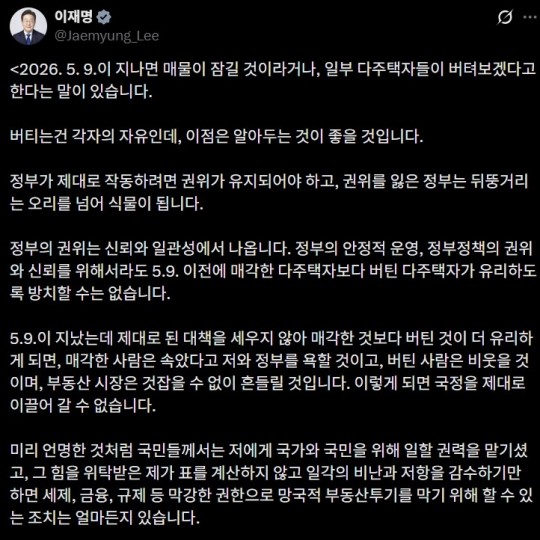 ¿¬ÇÕ´º½º¿¡ µû¸£¸é ÀÌÀç¸í ´ëÅë·ÉÀº 26ÀÏ "Á¤Ã¥ ¼ö´ÜÀ» Ãѵ¿¿øÇØ ´ÙÁÖÅÃÀÚ´Â ¹°·Ð ÁÖ°Å¿ëÀÌ ¾Æ´Ñ ÅõÀÚ·Åõ±â¿ë 1ÁÖÅÃÀÚµµ º¸À¯º¸´Ù ¸Å°¢ÀÌ À¯¸®ÇÑ »óȲÀ» ¸¸µé °Í"À̶ó°í ¹àÇû´Ù.