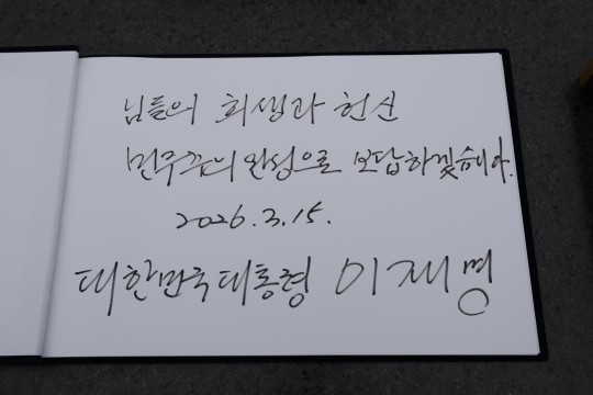 ÀÌÀç¸í ´ëÅë·ÉÀÌ 15ÀÏ °æ³² â¿ø½Ã ¸¶»êȸ¿ø±¸ ±¹¸³ 3·15 ¹ÎÁÖ ¹¦Áö Âü¹è¸¦ ¸¶Ä£ µÚ ÀÛ¼ºÇÑ ¹æ¸í·Ï. ÀÌ ´ëÅë·ÉÀº "´ÔµéÀÇ Èñ»ý°ú Çå½Å ¹ÎÁÖÁÖÀÇ ¿Ï¼ºÀ¸·Î º¸´äÇϰڽÀ´Ï´Ù"¶ó°í Àû¾ú´Ù. 2026.3.15 [û¿Í´ëÅë½Å»çÁø±âÀÚ´Ü](»çÁøÃâó=¿¬ÇÕ´º½º)