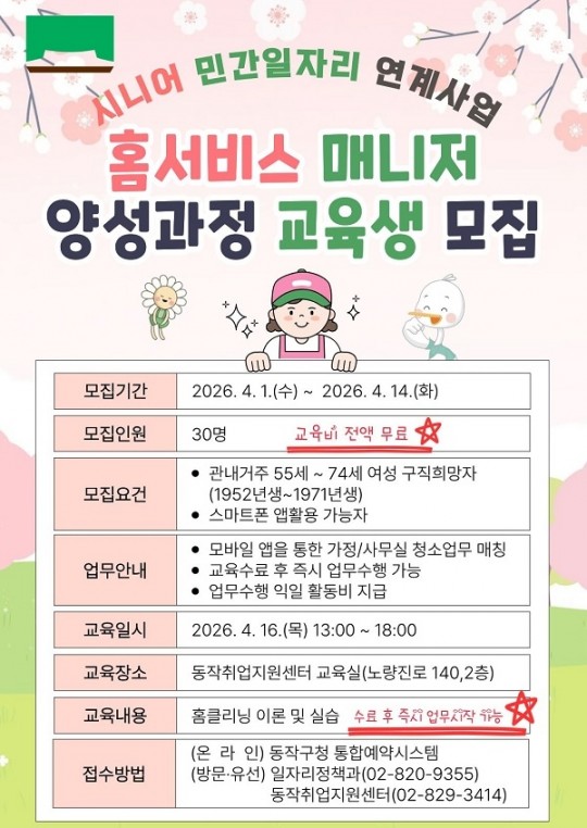 µ¿ÀÛ±¸(±¸Ã»Àå ¹ÚÀÏÇÏ)´Â ½Ã´Ï¾î ¿©¼ºÀÇ Àü¹® ¿ª·®À» °ÈÇÏ°í ¾ÈÁ¤ÀûÀÎ ÀÏÀÚ¸®¸¦ Áö¿øÇϱâ À§ÇØ ‘Ȩ¼ºñ½º ¸Å´ÏÀú ¾ç¼º °úÁ¤’ ±³À°»ýÀ» ¸ðÁýÇÑ´Ù°í ¹àÇû´Ù.