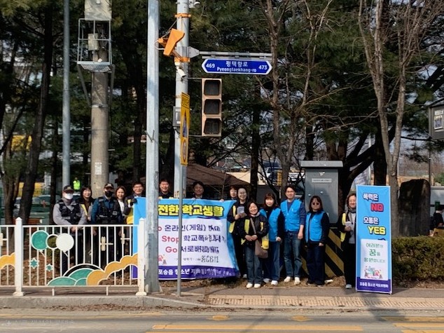 ‘NO 온라인(게임) 범죄, STOP 학교폭력’ 피켓을 들고 만호파출소 이봉주 경감도 함께 참여했다. 다문화 가정이 많은 포승지역의 특수성을 고려해 인근 파출소에서도 특별한 관심을 보였고, 금연 홍보용 대일밴드 등 기념품도 함께 전달했다.