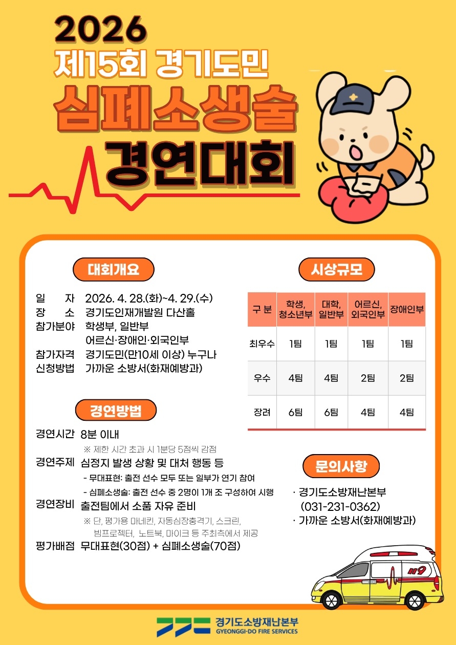 ¿¬ÇÕ´º½º¿¡ µû¸£¸é °æ±âµµ¼Ò¹æÀ糺»ºÎ´Â ½Ã¹ÎÀÇ ÀÀ±Þ»óȲ ´ëÀÀ ´É·ÂÀ» ³ôÀ̱â À§ÇØ ´ÙÀ½ ´Þ 9ÀϱîÁö 'Á¦15ȸ °æ±âµµ¹Î ½ÉÆó¼Ò»ý¼ú °æ¿¬´ëȸ' Âü°¡ÀÚ¸¦ ¸ðÁýÇÑ´Ù°í 26ÀÏ ¹àÇû´Ù.