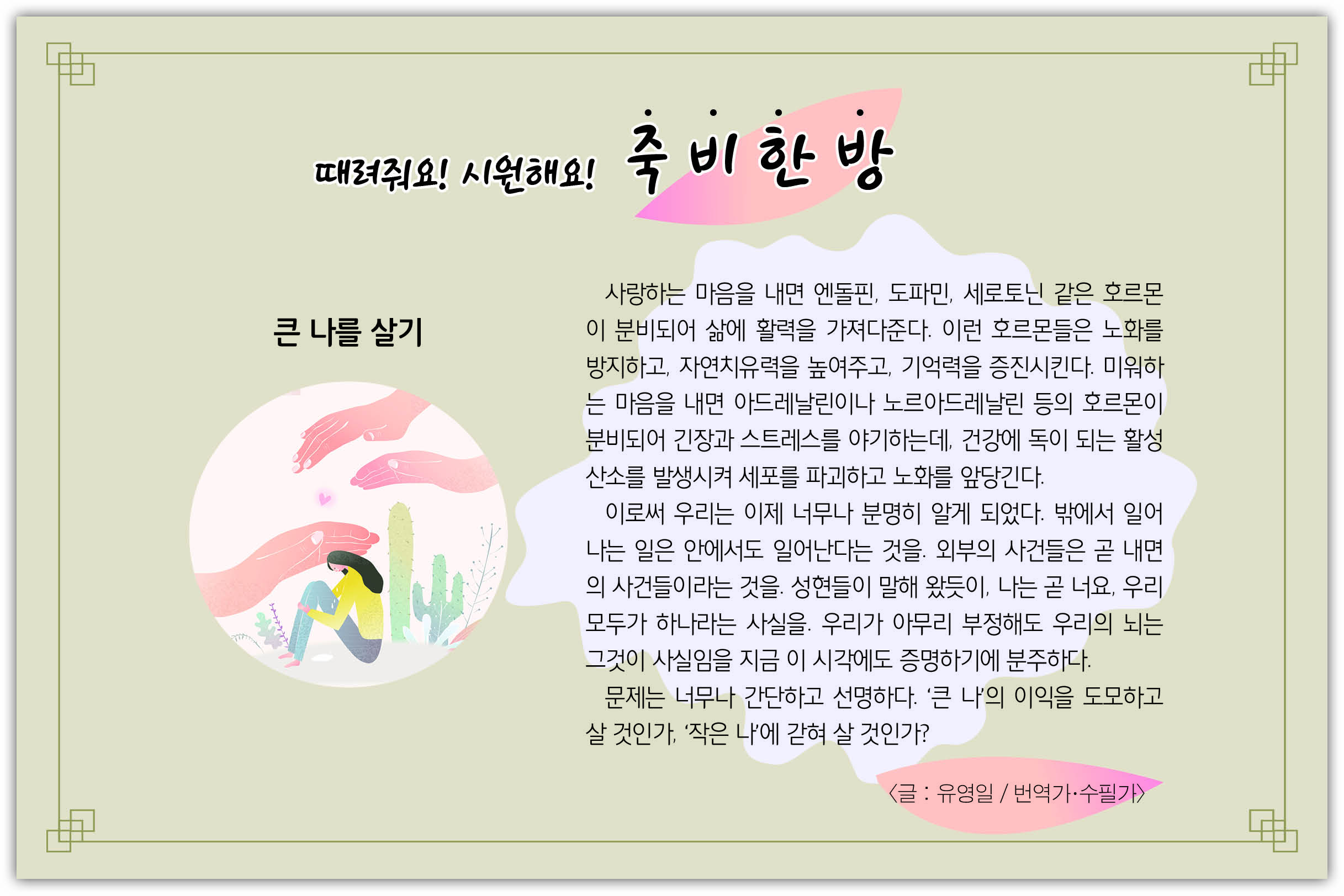 »ç¶ûÇÏ´Â ¸¶À½À» ³»¸é ¿£µ¹ÇÉ, µµÆÄ¹Î, ¼¼·ÎÅä´Ñ °°Àº È£¸£¸óÀÌ ºÐºñµÇ¾î »î¿¡ Ȱ·ÂÀ» °¡Á®´ÙÁØ´Ù. ÀÌ·± È£¸£¸óµéÀº ³ëȸ¦ ¹æÁöÇϰí, ÀÚ¿¬Ä¡À¯·ÂÀ» ³ô¿©ÁÖ°í, ±â¾ï·ÂÀ» ÁõÁø½ÃŲ´Ù. ¹Ì¿öÇÏ´Â ¸¶À½À» ³»¸é ¾Æµå·¹³¯¸°À̳ª ³ë¸£¾Æµå·¹³¯¸° µîÀÇ È£¸£¸óÀÌ ºÐºñµÇ¾î ±äÀå°ú ½ºÆ®·¹½º¸¦ ¾ß±âÇϴµ¥, °Ç°¿¡ µ¶ÀÌ µÇ´Â Ȱ¼º»ê¼Ò¸¦ ¹ß»ý½ÃÄÑ ¼¼Æ÷¸¦ ÆÄ±«ÇÏ°í ³ëȸ¦ ¾Õ´ç±ä´Ù.