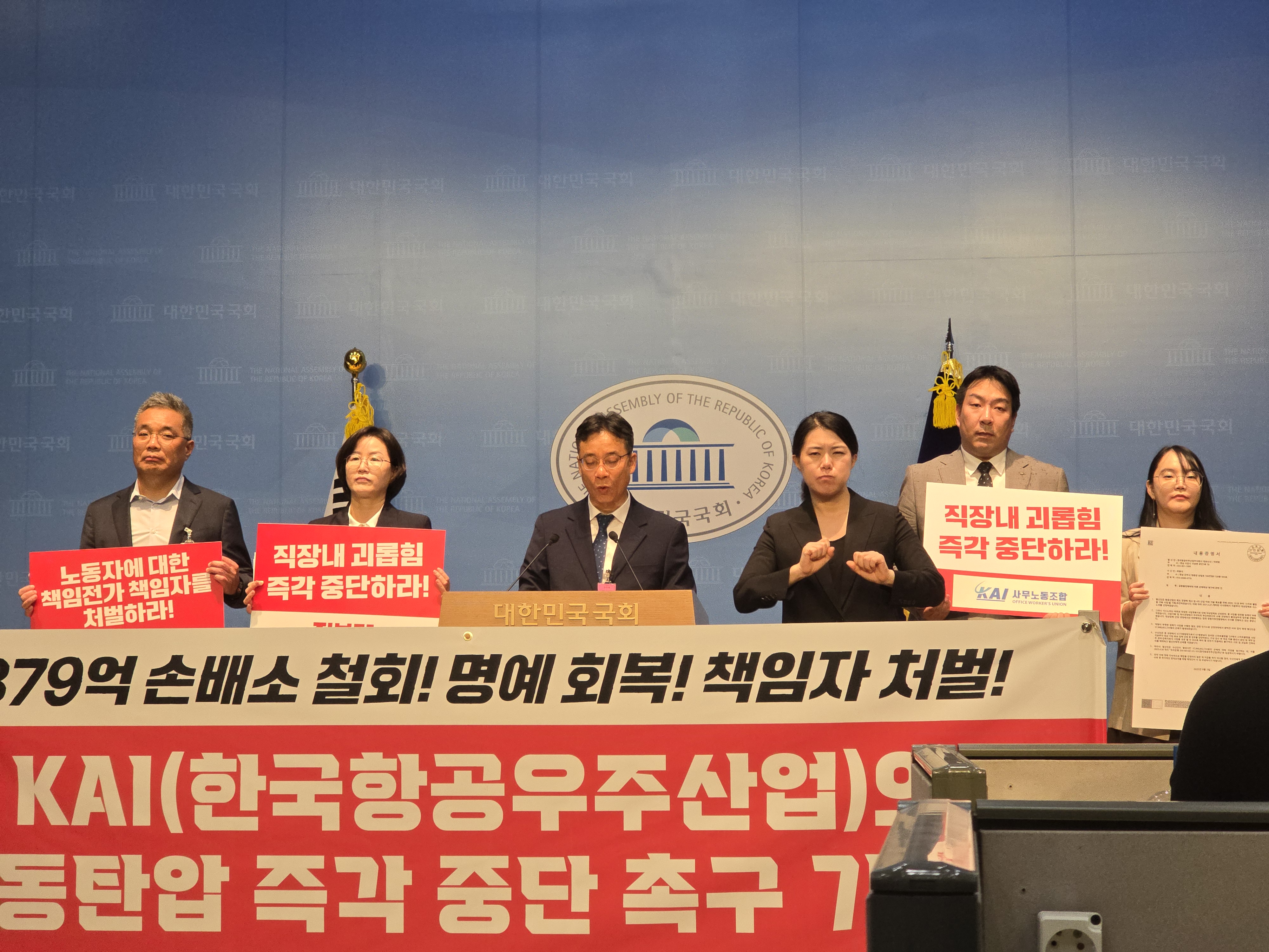 (ºÒž´º½º=Â÷º¹¿ø±âÀÚ) 9¿ù 24ÀÏ, ±¹È¸¼ÒÅë°ü ±âÀÚȸ°ßÀå¿¡¼ Çѱ¹Ç×°ø¿ìÁÖ»ê¾÷(KAI) »ç¹«³ëµ¿Á¶ÇÕ, Áøº¸´ç Á¤Çý°æÀÇ¿ø µî ¿©·¯ ´Üü°¡ ¸ð¿© '379¾ï ¼ÕÇØ¹è»ó öȸ, ¸í¿¹È¸º¹ ¹× Ã¥ÀÓÀÚ Ã³¹ú, ³ëµ¿Åº¾Ð Áï°¢ Áß´Ü'À» Ã˱¸ÇÏ´Â ±âÀÚȸ°ßÀ» ¿¾ú´Ù