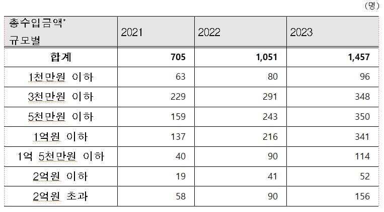 ÀÌ °°Àº ½ÃÀå È®´ë¿¡ ÈûÀÔ¾î, Á¾Çռҵ漼 ½Å°íÀÚ¸¦ ±âÁØÀ¸·Î ÇØ¸¶´Ù 2¾ï ¿øÀÌ ³Ñ´Â ¼ÒµæÀ» ¿Ã¸®´Â À̸¥¹Ù ‘SNS ¸¶ÄÏ ´ë¹Ú »ç¾÷ÀÚ’´Â 2021³â 58¸í¿¡¼ 2023³â 156¸íÀ¸·Î 2.5¹è °¡±îÀÌ ´Ã¾úÀ¸¸ç, Á¾Çռҵ漼¸¦ ½Å°íÇÑ ‘SNS ¸¶ÄÏ’ »ç¾÷ÀÚÀÇ ÃѼöÀԱݾ׵µ 2021³â 552¾ï ¿ø¿¡¼ 2023³â 1,436¾ï ¿øÀ¸·Î 3¹è °¡±îÀÌ Áõ°¡Çß´Ù.