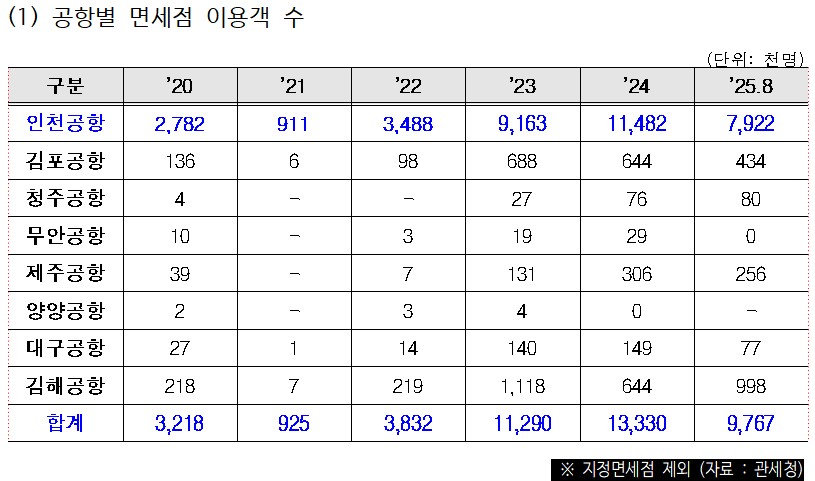 (ºÒž´º½º=Â÷º¹¿ø±âÀÚ)±¹È¸ ±âȹÀçÁ¤À§¿øÈ¸ ¼Ò¼Ó ´õºÒ¾î¹ÎÁÖ´ç Á¤ÀÏ¿µ ÀÇ¿ø(ÀÎõ ¿¬¼öÀ»)ÀÌ °ü¼¼Ã»À¸·ÎºÎÅÍ Á¦Ãâ¹ÞÀº ÀÚ·á¿¡ µû¸£¸é, Àü±¹ °øÇ× ¸é¼¼Á¡ ¸ÅÃâÀº 2022³â 6,007¾ï ¿ø¿¡¼ 2024³â 2Á¶ 1,459¾ï ¿øÀ¸·Î 3.5¹è ÀÌ»ó ±ÞÁõÇßÀ¸¸ç, 2025³â »ó¹Ý±â¿¡¸¸ 1Á¶ 7,000¾ï ¿øÀ» ±â·ÏÇÏ¸ç °í¼Ó ¼ºÀå¼¼¸¦ À̾´Ù.