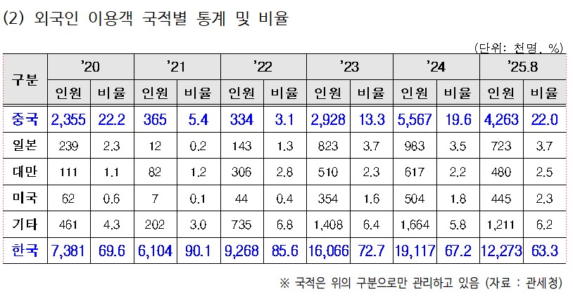 ƯÈ÷ Áß±¹ÀÎ °ü±¤°´Àº 2020³â 235¸¸ ¸í¿¡¼ 2024³â 550¸¸ ¸íÀ¸·Î 2¹è ÀÌ»ó Áõ°¡ÇØ, ¿Ü±¹ÀÎ Àüü ¹æ¹®°´ÀÇ Àý¹Ý°¡·®À» Â÷ÁöÇϰí ÀÖ´Ù. 2025³â »ó¹Ý±â Áß±¹ÀÎ °ü±¤°´ ¼öµµ Àü³â ´ëºñ 23% ´Ã¾î³ª¸ç Áõ°¡¼¼°¡ ¶Ñ·ÇÇÏ´Ù.