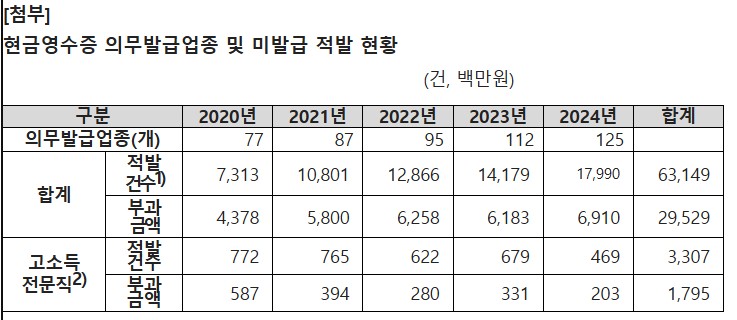 ±¹È¸ ±âȹÀçÁ¤À§¿øÈ¸ Á¶½Â·¡ ÀÇ¿ø(´õºÒ¾î¹ÎÁÖ´ç)ÀÌ ±¹¼¼Ã»À¸·ÎºÎÅÍ Á¦Ãâ¹ÞÀº ÀÚ·á¿¡ µû¸£¸é, 2020³âºÎÅÍ 2024³â±îÁö ÃÖ±Ù 5³â°£ Çö±Ý¿µ¼öÁõ Àǹ«¹ß±Þ¾÷Á¾ÀÇ ¹Ì¹ß±Þ Àû¹ß °Ç¼ö´Â ÃÑ 63,149°Ç, °°Àº ±â°£ ºÎ°úµÈ °¡»ê¼¼ ±Ô¸ð´Â 295¾ï 2,900¸¸ ¿ø¿¡ ´ÞÇÏ´Â °ÍÀ¸·Î È®ÀεƴÙ.