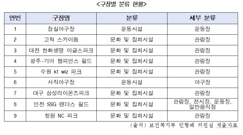 ƯÈ÷ º¸°Çº¹ÁöºÎ¿¡ µû¸£¸é, ¿îµ¿½Ã¼³·Î ºÐ·ùµÈ ¾ß±¸ÀåÀº ÆíÀǽü³ ¼³Ä¡ ±âÁØÀÌ Àǹ«°¡ ¾Æ´Ñ ‘±ÇÀå’¿¡ ±×Ä£´Ù. ‘¹®È ¹× Áýȸ½Ã¼³’·Î ºÐ·ùµÈ ±¤ÁÖ±â¾ÆÃ¨ÇǾð½ºÇÊµå µîÀº ¹ýÀû ¼³Ä¡ Àǹ«°¡ Àû¿ëµÇ´Â ¹Ý¸é, ‘¿îµ¿½Ã¼³’·Î ºÐ·ùµÈ Àá½Ç¾ß±¸Àå°ú »çÁ÷¾ß±¸ÀåÀº »ç½Ç»ó Àǹ« ±ÔÁ¤¿¡¼ ¹þ¾î³ª ÀÖ´Ù. °ÇÃ๰ ¿ëµµ ºÐ·ù´Â ÁöÀÚü ´ã´çÀ¸·Î, °°Àº ÇÁ·Î½ºÆ÷Ã÷ °æ±âÀåÀÓ¿¡µµ ÁöÀÚüÀÇ ÆÇ´Ü¿¡ µû¶ó ±¸À帶´Ù Àû¿ë ±âÁØÀÌ Á¦°¢°¢ÀÎ ¼ÀÀÌ´Ù.