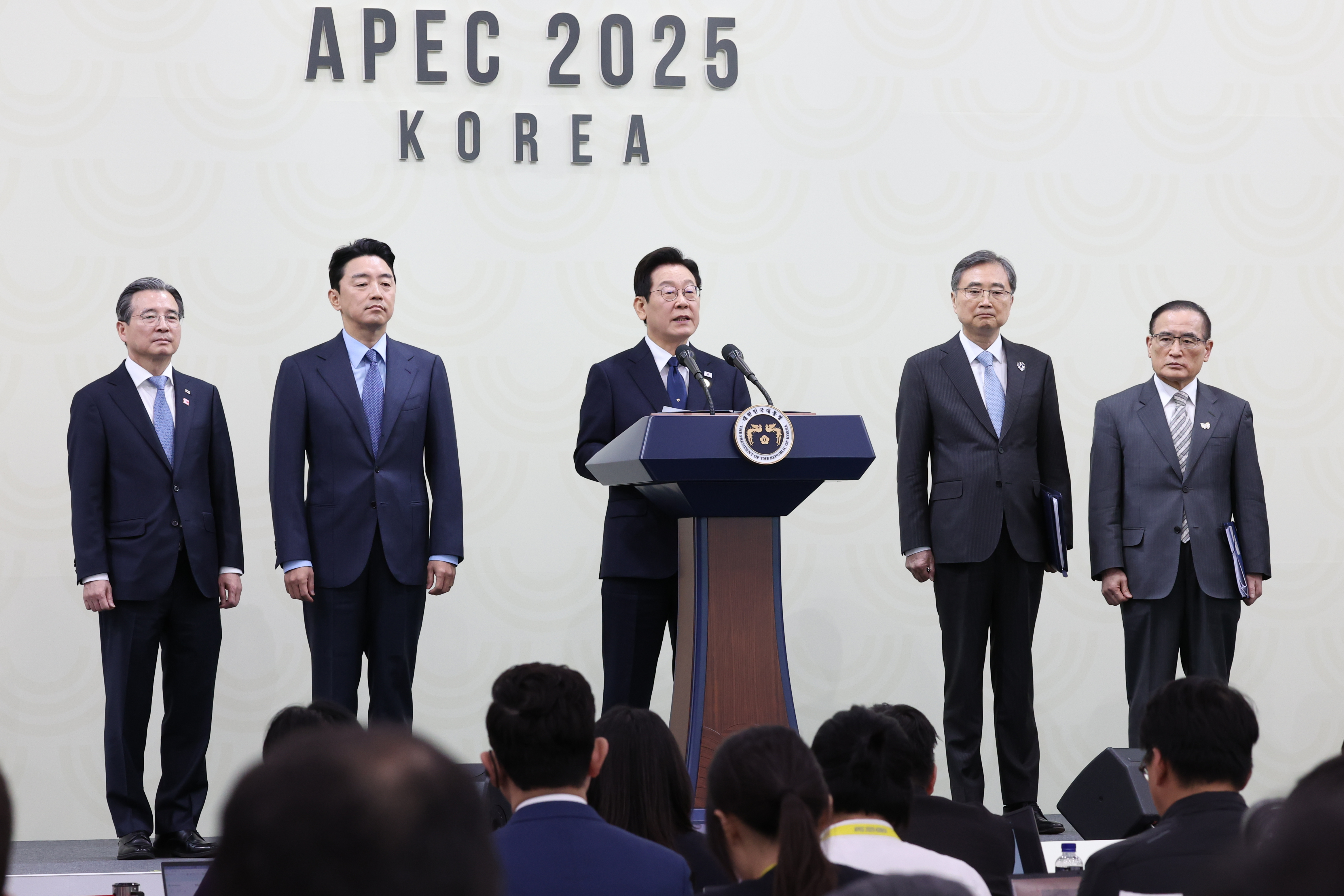 ÀÌÀç¸í ´ëÅë·ÉÀÌ 1ÀÏ °æÁÖȹéÄÁº¥¼Ç¼¾ÅÍ(HICO)¿¡¼ ¿¸° 2025 ¾Æ½Ã¾ÆÅÂÆò¾ç°æÁ¦Çù·Âü(APEC) Á¤»óȸÀÇ ±âÀÚȸ°ß¿¡¼ ¹ß¾ðÇϰí ÀÖ´Ù. ¿ÞÂʺÎÅÍ ±è¿ë¹ü Á¤Ã¥½ÇÀå, °ÈÆ½Ä ºñ¼½ÇÀå, ÀÌ ´ëÅë·É, Á¶Çö ¿Ü±³Àå°ü, À§¼º¶ô ¾Èº¸½ÇÀå.(»çÁøÃâó=¿¬ÇÕ´º½º)