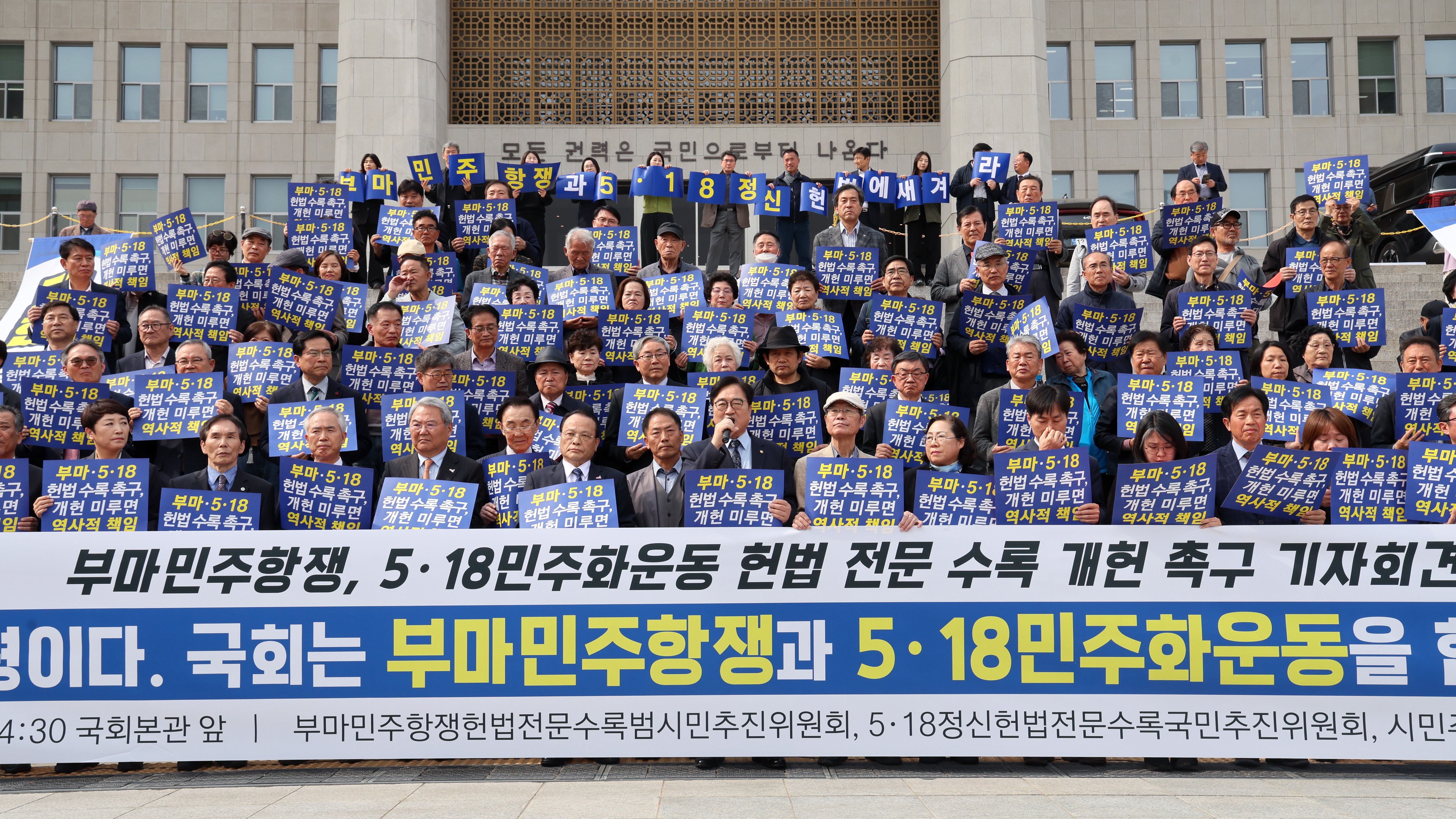 ¡ã±¹È¸ º»Ã» °è´Ü ¾Õ¿¡¼ ¿¸° 'ºÎ¸¶¹ÎÁÖÇ×Àï, 5·18¹ÎÁÖȿ Çå¹ý Àü¹® ¼ö·Ï °³Çå Ã˱¸ ±âÀÚȸ°ß' ÇöÀåÀ» ã¾Æ ¹ß¾ðÇϰí ÀÖ´Ù.(»çÁø=±¹È¸»ç¹«Ã³ »çÁøÆÀ)