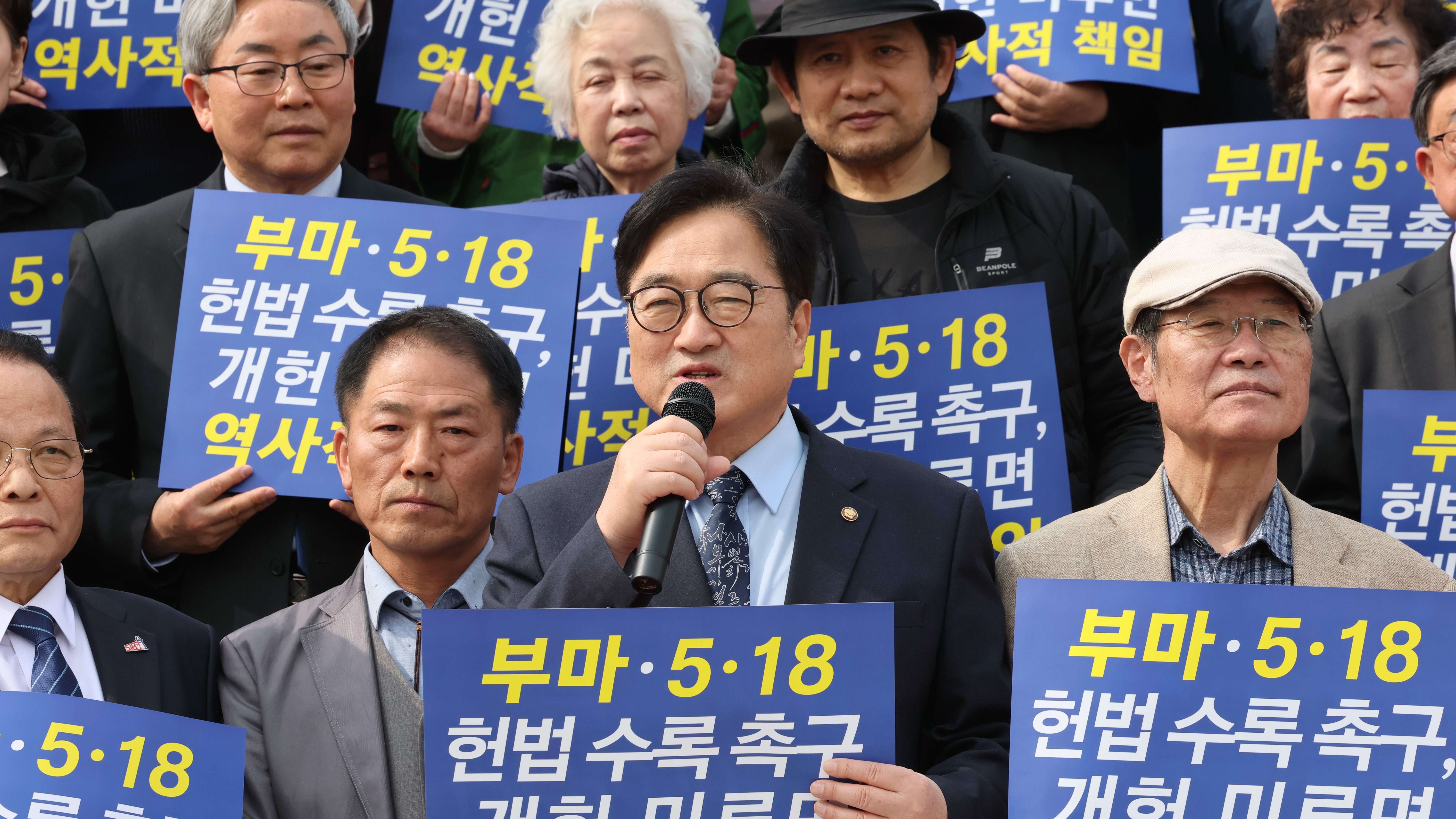 ¡ã¿ì¿ø½Ä ±¹È¸ÀÇÀåÀÌ 30ÀÏ(¿ù) ¿ÀÈÄ ±¹È¸ º»Ã» °è´Ü ¾Õ¿¡¼ ¿¸° 'ºÎ¸¶¹ÎÁÖÇ×Àï, 5·18¹ÎÁÖȿ Çå¹ý Àü¹® ¼ö·Ï °³Çå Ã˱¸ ±âÀÚȸ°ß' ÇöÀåÀ» ã¾Æ ¹ß¾ðÇϰí ÀÖ´Ù.(»çÁø=±¹È¸»ç¹«Ã³ »çÁøÆÀ)