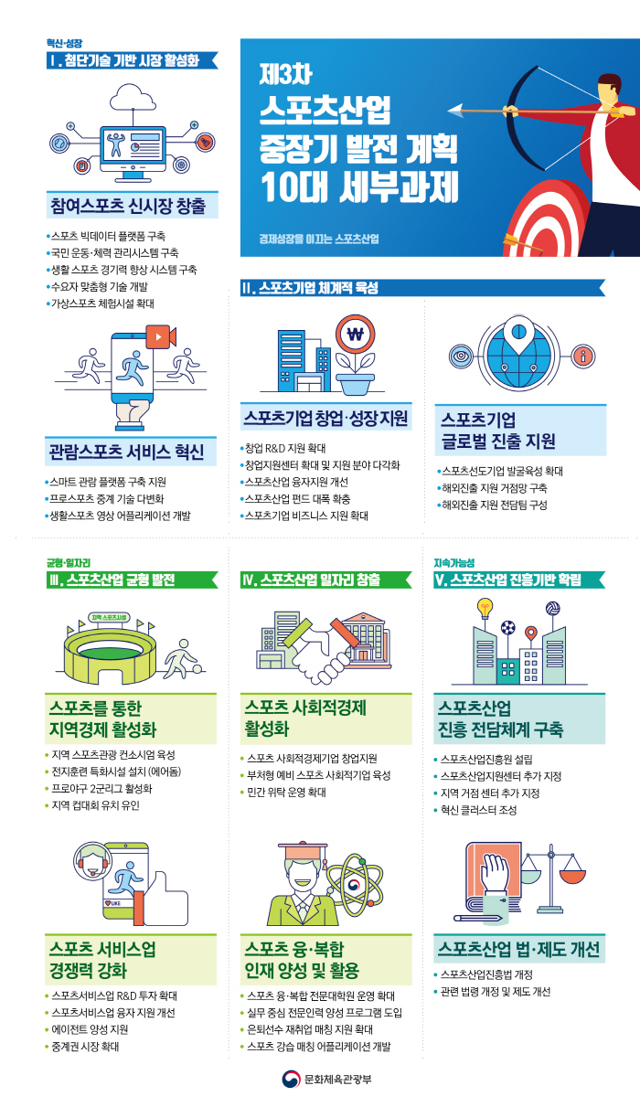 ÀÌ¿¡ ¹®Ã¼ºÎ´Â À̹ø ÁßÀå±â °èȹ¿¡¼ ¡â±¹³» ½ºÆ÷Ã÷»ê¾÷½ÃÀå ±Ô¸ð È®Àå(’17³â ¾à 75Á¶ ¿ø → ’23³â 95Á¶ ¿ø), ¡â ±â¾÷ÀÇ ¿µ¼¼¼º ¿ÏÈ, ¡â ÀÛÁö¸¸ °ÇÑ ±â¾÷ À°¼º µî 3°¡Áö ¸ñÇ¥¸¦ ¼ö¸³Çϰí À̸¦ ½ÇÇàÇϱâ À§ÇÑ 5´ë Àü·«°ú 10´ë °úÁ¦(41°³ ¼¼ºÎ°úÁ¦)¸¦ µµÃâÇß´Ù.¹®Ã¼ºÎ´Â »õ·Î¿î Âü¿©½ºÆ÷Ã÷ ½ÃÀåÀ» âÃâÇÏ°í °ü¶÷½ºÆ÷Ã÷ ¼ºñ½º¸¦ Çõ½ÅÇϱâ À§ÇØ ±â¼ú°³¹ßÀ» Áö¿øÇϱâ·Î ¾à¼ÓÇß´Ù. »õ·Î¿î ½ºÆ÷Ã÷ ½ÃÀåÀ» âÃâÇϱâ À§ÇØ ºòµ¥ÀÌÅÍ Ç÷§ÆûÀ» ±¸ÃàÇÏ¿© »ê¾÷Àû Ȱ¿ëÀ» µµ¸ðÇϰí, ±¹¹Î ¿îµ¿·Ã¼·Â °ü¸®½Ã½ºÅÛÀ» ±¸ÃàÇØ ½º¸¶Æ® °Ç°°ü¸®(ÇコÄɾî) µî¿¡ Ȱ¿ëÇÒ ¼ö ÀÖ´Â ¿îµ¿´É·Â·½Åü Ç¥ÁØ ÁöÇ¥¸¦ °³¹ßÇÒ ¿¹Á¤ÀÌ´Ù.