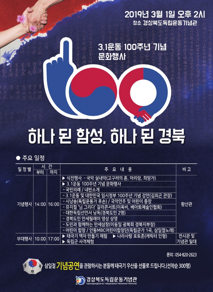 °æ»óºÏµµµ¶¸³¿îµ¿±â³ä°ü(°üÀå ±èÈñ°ï)Àº 3·1¿îµ¿ ¹× ´ëÇѹα¹ÀÓ½ÃÁ¤ºÎ ¼ö¸³ 100ÁÖ³âÀ» ¸ÂÀº ¿ÃÇØ µµ¹Îµé°ú ÇÔ²²ÇÏ´Â ´Ù¾çÇÑ »ç¾÷À» ÃßÁøÇÑ´Ù. ±× ù°ÉÀ½À¸·Î ¿À´Â 3‧1Àý¿¡´Â ‘Çϳª µÈ ÇÔ¼º, Çϳª µÈ °æºÏ’À̶ó´Â À̸§ ¾Æ·¡ ´Ùä·Î¿î ¹®ÈÇà»ç°¡ ¿¸°´Ù.