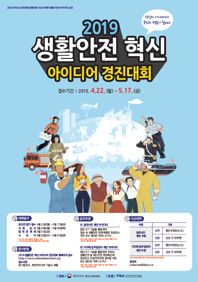 ÇàÁ¤¾ÈÀüºÎ(Àå°ü Áø¿µ)¿Í Çѱ¹Áö¿ªÁ¤º¸°³¹ß¿ø(¿øÀå Áö´ë¹ü)Àº 4¿ù 22ÀϺÎÅÍ 5¿ù 17ÀϱîÁö ‘2019 »ýȰ¾ÈÀü Çõ½Å ¾ÆÀ̵ð¾î °æÁø´ëȸ’¸¦ ¿¾î »ýȰ¾ÈÀü ¹®Á¦ ÇØ°áÀ» À§ÇÑ ±¹¹ÎÀÇ ´Ù¾çÇÑ ÀǰßÀ» ¹Þ´Â´Ù. ¿ÃÇØ´Â ÀϹݱ¹¹Î, Àü¹®°¡»Ó¸¸ ¾Æ´Ï¶ó ÁöÀÚü ´ã´çÀÚ ºÎ¹®À» Ãß°¡ÇØ Áö¿ª ¹®Á¦Çذá°ú ÇöÀå¿¡ ¹Ù·Î Àû¿ë °¡´ÉÇÑ ¾ÆÀ̵ð¾î Á¦¾ÈÀÌ ¸¹À» °ÍÀ¸·Î ±â´ëµÈ´Ù.