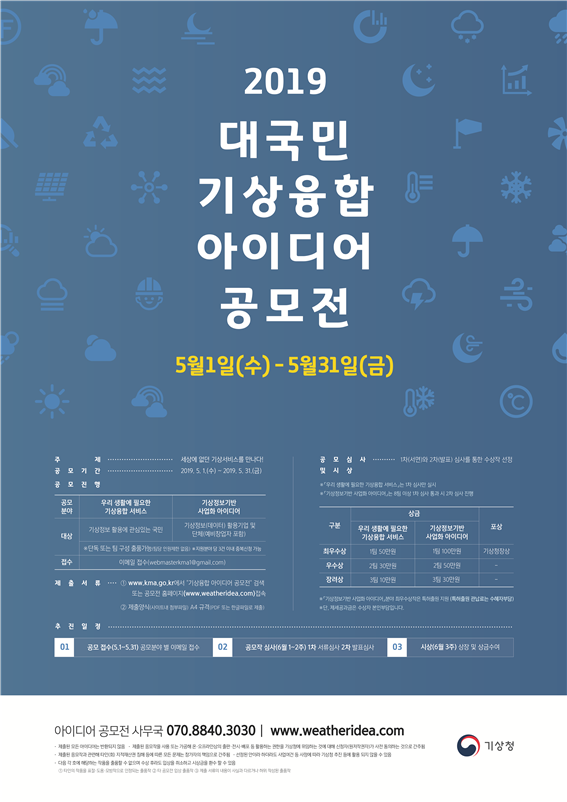 ±â»óû(ûÀå ±èÁ¾¼®)Àº 5¿ù 1ÀϺÎÅÍ 31ÀϱîÁö ‘2019 ´ë±¹¹Î ±â»óÀ¶ÇÕ ¾ÆÀ̵ð¾î °ø¸ðÀü’À» °³ÃÖÇÑ´Ù. ‘¼¼»ó¿¡ ¾ø´ø ±â»ó¼ºñ½º¸¦ ¸¸³ª´Ù’¸¦ ÁÖÁ¦·Î °³ÃֵǴ À̹ø °ø¸ðÀüÀº ±â»ó±âÈÄÁ¤º¸¸¦ ´Ù¾çÇÑ ºÐ¾ß¿¡ Á¢¸ñÇÏ¿© »õ·Î¿î ±â»óÀ¶ÇÕ ¼ºñ½º¸¦ âÃâÇϰíÀÚ ¸¶·ÃµÆ´Ù.