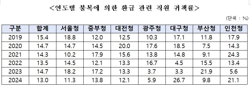 ƯÈ÷ ºÒº¹ »ç°Ç Áß Á÷¿ø ±ÍÃ¥·üÀÌ ¹®Á¦·Î ÁöÀûµÈ´Ù. ÃÖ±Ù 6³â°£ ±¹¼¼Ã» Àüü ±ÍÃ¥·üÀº 13~15% ¾ÈÆÆ¿¡ ¸Ó¹°·¯, Á¶¼¼ ºÒº¹ 10°Ç °¡¿îµ¥ 1°Ç ÀÌ»óÀº Á÷¿ø À߸øÀ¸·Î ȯ±ÞÀÌ ¹ß»ýÇÑ ¼ÀÀÌ´Ù.