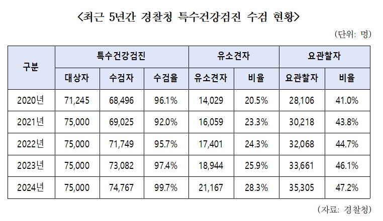 7ÀÏ ´õºÒ¾î¹ÎÁÖ´ç ÇѺ´µµ ÀÇ¿ø(ÀüºÏ ÀÍ»êÀ»)ÀÌ °æÂûûÀ¸·ÎºÎÅÍ Á¦Ãâ¹ÞÀº ÀÚ·á¿¡ µû¸£¸é, °æÂû°ü Ư¼ö°Ç°°ËÁø¿¡¼ ‘À¯¼Ò°ß’À» Áø´Ü¹ÞÀº °æÂû°üÀÌ 2020³â 1¸¸ 4,029¸í¿¡¼ 2021³â 1¸¸ 6,059¸í, 2022³â 1¸¸ 7,401¸í, 2023³â 1¸¸ 8,944¸í, 2024³â 2¸¸ 1,167¸íÀ¸·Î ¸Å³â Áõ°¡ÇÑ °ÍÀ¸·Î µå·¯³µ´Ù.