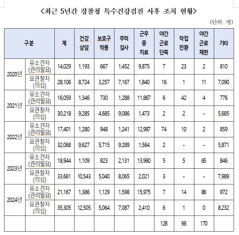 ÇѺ´µµ ÀÇ¿øÀº “¹ã»ùÀ̳ª ¾ß°£ ±Ù¹«°¡ ÀÏ»óÀÎ °æÂû°üµéÀº Ÿ Á÷±º¿¡ ºñÇØ Áúº´ ¹ß»ý À§ÇèÀÌ Å« ¸¸Å, ´õ ¼¼½ÉÇÑ °ü¸®°¡ ÇÊ¿äÇÏ´Ù”¶ó°í °Á¶Çϸç, “°æÂûûÀº ÇöÀç 7¸¸ 5õ ¸íÀÎ ¿¬°£ ¼ö°ËÀÚ ¼ö¸¦ ´ëÆø È®´ëÇÏ°í °ËÁø Ç׸ñµµ Ãß°¡Çؼ ü°èÀûÀÎ Á÷¿ø °Ç° °ü¸®¿¡ ³ë·ÂÇØ¾ß ÇÑ´Ù”¶ó°í °Á¶Çß´Ù.