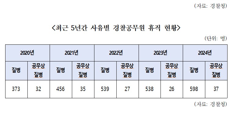 ÇÑÆí, °æÂû°ø¹«¿ø Áúº´ ÈÞÁ÷Àº 2020³â 373¸í¿¡¼ 2021³â 456¸í, 2022³â 539¸í, 2023³â 538¸í, 2024³â 598¸íÀ¸·Î Áõ°¡ Ãß¼¼¿¡ ÀÖ¾ú°í, °ø¹«»ó Áúº´ ÈÞÁ÷µµ 2020³â 32¸í¿¡¼ 2024³â 37¸íÀ¸·Î ´Ã¾ú´Ù.