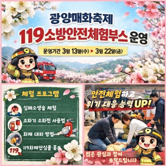 (ºÒž´º½º=Çѱ⼮±âÀÚ) ±¤¾ç¼Ò¹æ¼(¼Àå ±è¿Á¿¬)°¡ º½À» ¸Â¾Æ Á¦25ȸ ±¤¾ç¸ÅÈÃàÁ¦Àå¿¡¼ ½Ã¹Î°ú °ü±¤°´À» ´ë»óÀ¸·Î ÇÑ ‘119¼Ò¹æ¾ÈÀüüÇèºÎ½º’¸¦ º»°Ý ¿î¿µÇÑ´Ù. À̹ø üÇèºÎ½º´Â 13ÀϺÎÅÍ ¿À´Â 22ÀϱîÁö ÃÑ 10Àϰ£ ¿î¿µµÉ ¿¹Á¤ÀÌ´Ù.