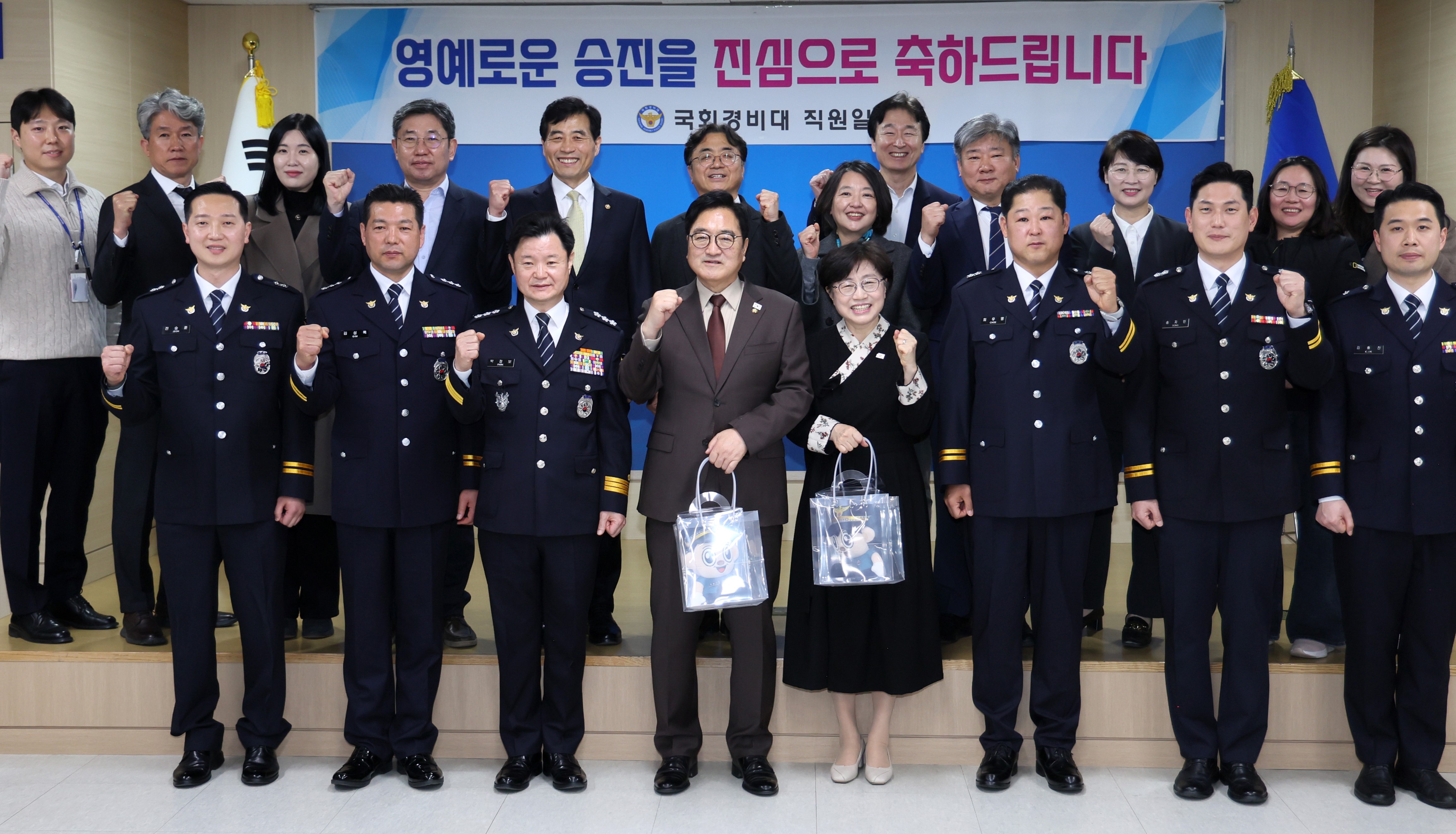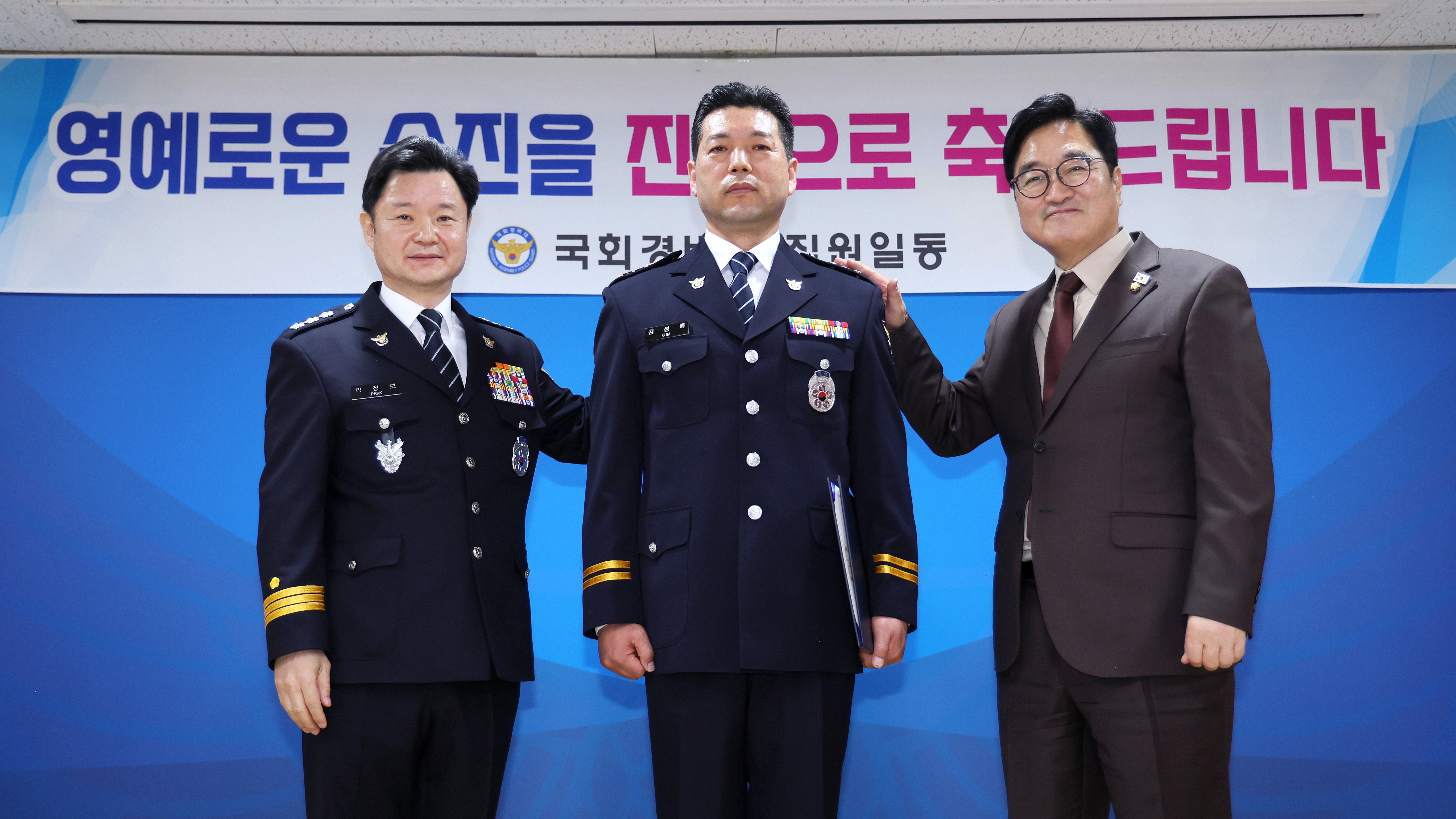 ¡ã ¿ì¿ø½Ä ±¹È¸ÀÇÀå ±¹È¸ °æºñ´ë 1Ãþ Çϸð´ÏȦ¿¡¼ ¿¸° '±¹È¸°æºñ´ë Ưº°½ÂÁø ÀÓ¿ë½Ä'¿¡ Âü¼®ÇØ °æ°¨¿¡¼ °æÁ¤À¸·Î ½ÂÁøÇÑ ±è¼º·Ï °æÈ£´ëÀåÀ» °Ý·ÁÇϰí ÀÖ´Ù. ¿ÞÂʺÎÅÍ ¹ÚÁ¤º¸ ¼¿ï°æÂûûÀå, ±è¼º·Ï °æÈ£´ëÀå, ¿ì¿ø½Ä ±¹È¸ÀÇÀå.(»çÁø=±¹È¸»ç¹«Ã³ »çÁøÆÀ)